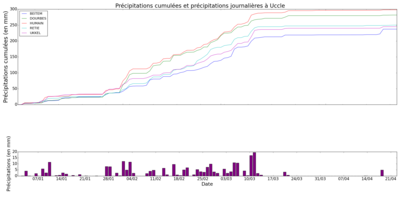 Au-dessus : Cumul des précipitations pour les stations de Beitem, Dourbes, Humain, Retie et Uccle. En dessous : Précipitations journalières à Uccle, pour la période du 1 janvier au 14 avril 2020.