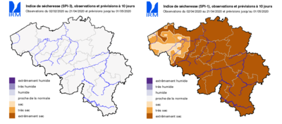 Des informations plus complètes sont disponibles sur notre site web au sujet de la situation actuelle et prévue de la sécheresse météorologique dans notre pays. L’indice de sécheresse à une échelle temporelle plus longue (Standardized Precipitation Index pour une période de 3 mois, soit SPI-3, ci-dessous à gauche), montre, de par la période humide de février et de début mars, une situation normale. Le début de l’état de sécheresse ne devient clair qu'en raccourcissant l'échelle de temps (SPI-1 pour une période de 1 mois, ci-dessous à droite).