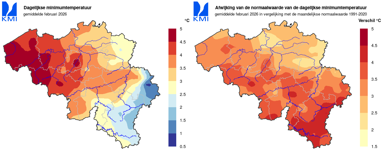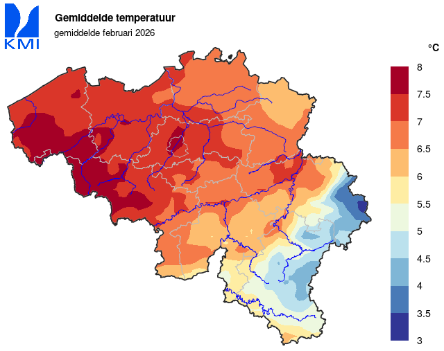 In ons land werd de laagste minimumtemperatuur op 15 februari in Mont-Rigi (Weismes) gemeten met -7,8°C. De hoogste temperatuur werd op de 25ste in Kapelle-op-den-Bos