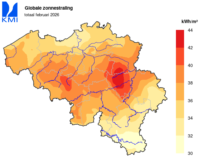 In het klimatologisch meetnet van het KMI werd het grootste dagtotaal op 11 februari gemeten. In Sugny (Vresse-sur-Semois) viel er toen 38,3 mm.